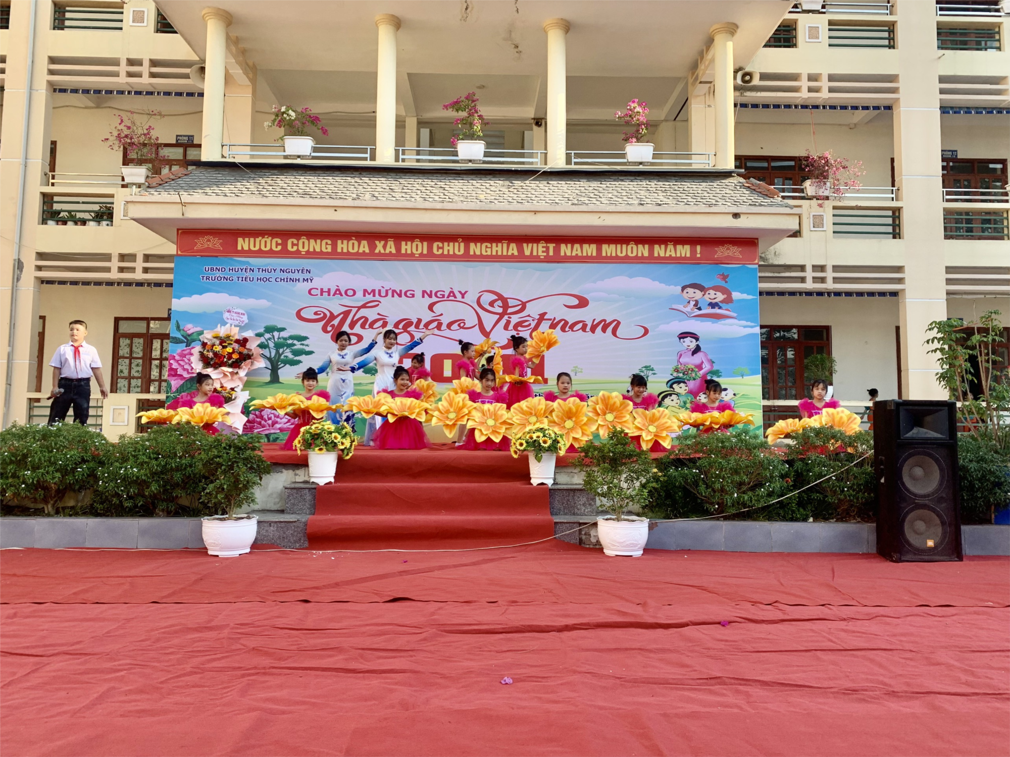 Năm nay, trường đã tổ chức một buổi lễ kỷ niệm đơn giản nhưng thật ý nghĩa. Ngay từ sáng sớm, sân trường đã rộn rã tiếng nhạc vang lên các bài hát về thầy cô.
